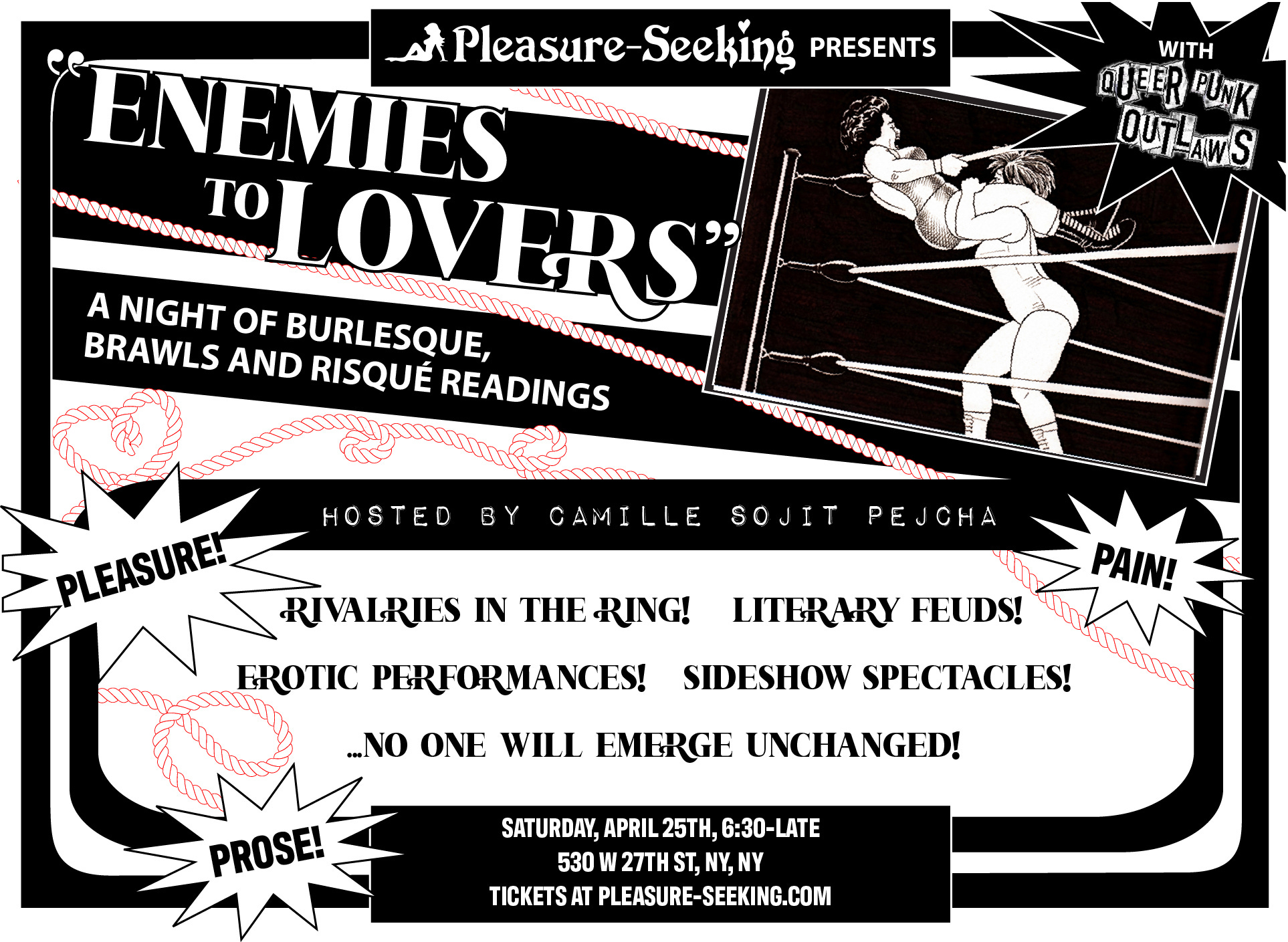 Upstairs in the Pleasure-Seeking lounge, burlesque royalty will entertain and titillate with boundary-pushing performances—in between steamy stories of sexual tension from our favorite writers in New York. I’m even teaming up with my friend Tom Frazier of Queer Punk Outlaws to stage real rivalries in the ring (yes, there will be a ring.)