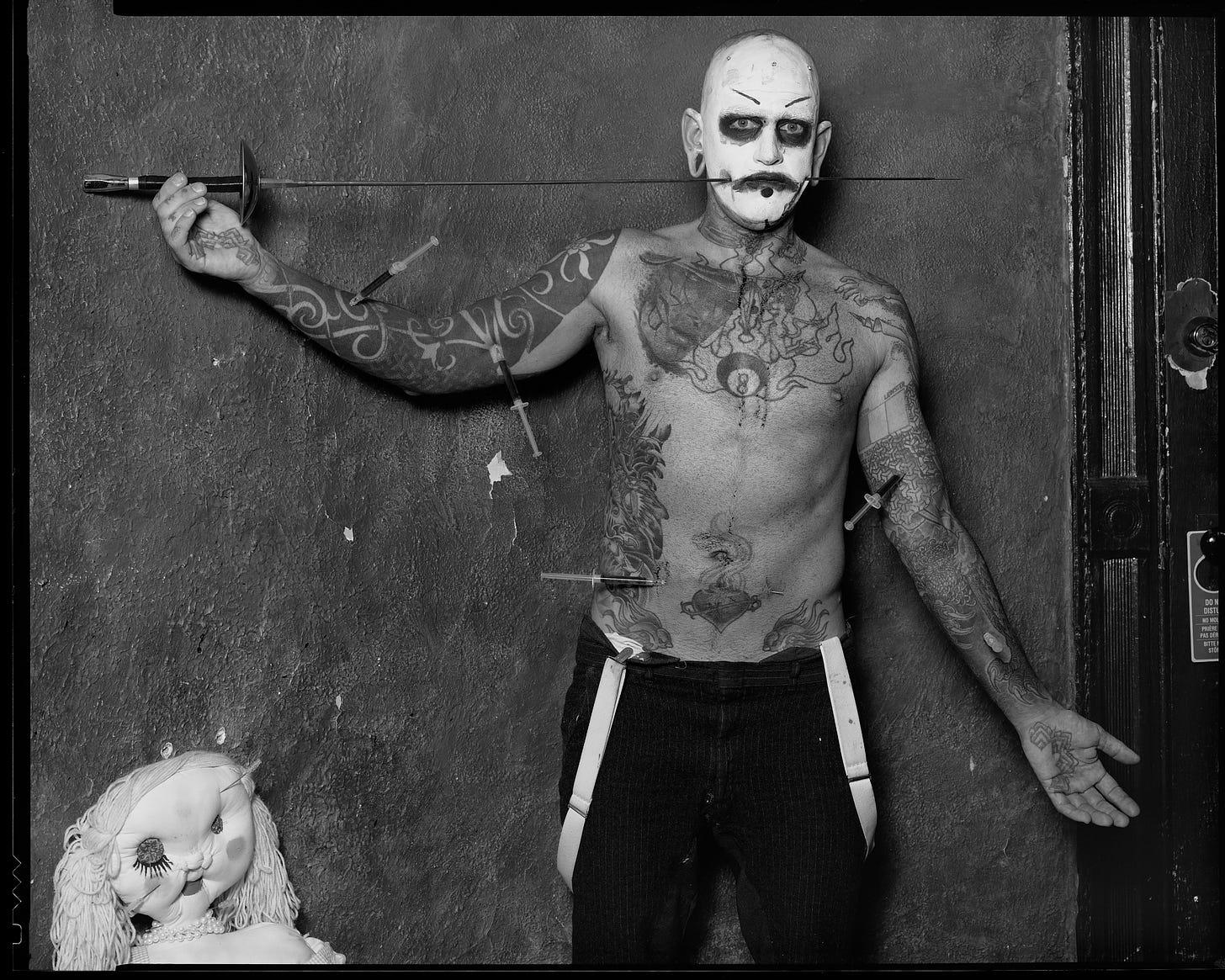 I met Damien at the Slipper Room. One night, James called and said, “Oh, you gotta come down and see this new act.” I knew it was gonna be good, ’cause James doesn’t often say that, so I went down to the Slipper Room, and it was really one of the first times I’d ever seen someone put a sword through their face. He’s lying there with fifteen-inch syringes through his arms, and I’m standing on the side of the stage looking, like, “Are you fucking kidding?” I just transcended watching his whole performance. When you first see it, it’s almost like you can’t watch it, but you want to.